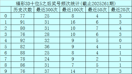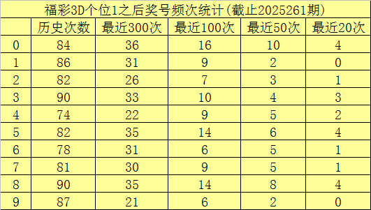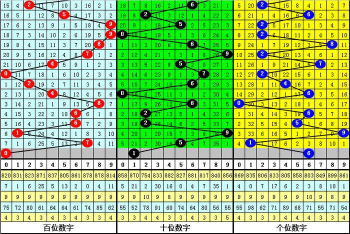 十位杀号:上期十位奖号为5,历史上十位奖号5共出现827期,前100次十位开出奖号5时,其下期0-9奖号频次分裂为:奖号1开出16次,9开出14次,2、3开出10次,4、5、7开出9次,0、6开出8次,8开出7次。