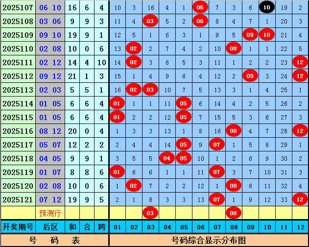 前区冷热走势(遗漏值0-4为冷码,遗漏值4以上为冷码):上期冷码出现1个:03,前区冷热比为1:4,最近10期冷热比为18:32,热码开出比例较高,本期重防热码持续活跃,提神全热码组合。