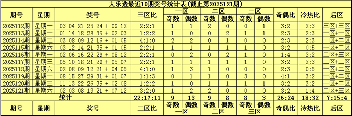 总而言之,大乐透第2025122期前区三区比看好2:2:1。