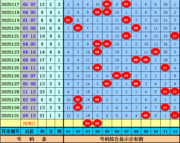 前区余数质合分析:上期前区包含3个质尾奖号:03、25、32,开出2个合尾奖号:08、29,最近10期前区奖号质合余数个数比为23:27,合尾奖号走势比拟活跃,本期郑重合尾号码走冷,看好质尾奖号回补,展望开出4个质尾奖号。