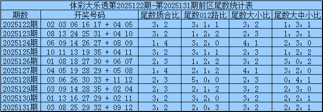 体彩大乐透第2025131期开奖号码为:03 08 25 29 32 + 09 12其中前区奖号奇偶比为3:2,大小比为3:2,012路为1:1:3,前区余数质合比为3:2,012路比为2:0:3,大小比为3:2,大中小比2:2:1。