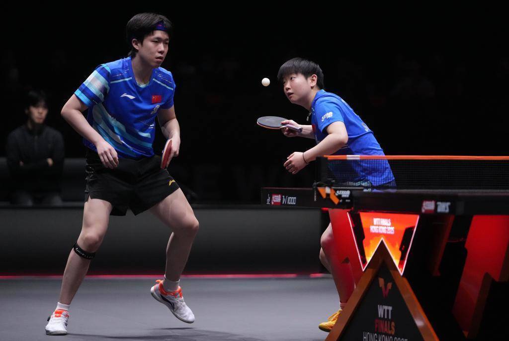 2025年12月13日,王楚钦/孙颖莎(右)在2025年世界乒乓球干事大定约(WTT)总决赛混双决赛中。新华社发(吕小炜 摄)
